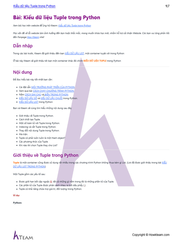 HOWKTEAM.VN - Kiểu dữ liệu Tuple trong Python | PDF