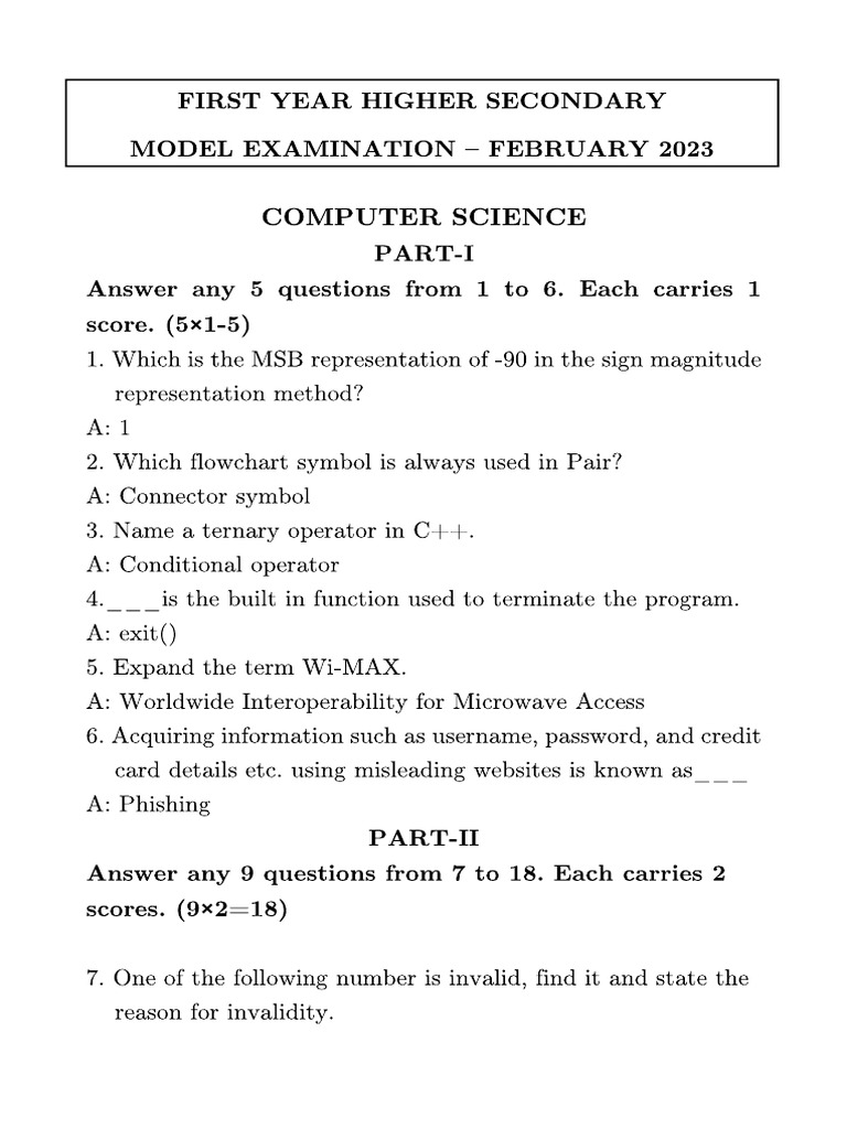 Kerala Plus One Computer Science Model Exam Question Paper Feb 2023 ...
