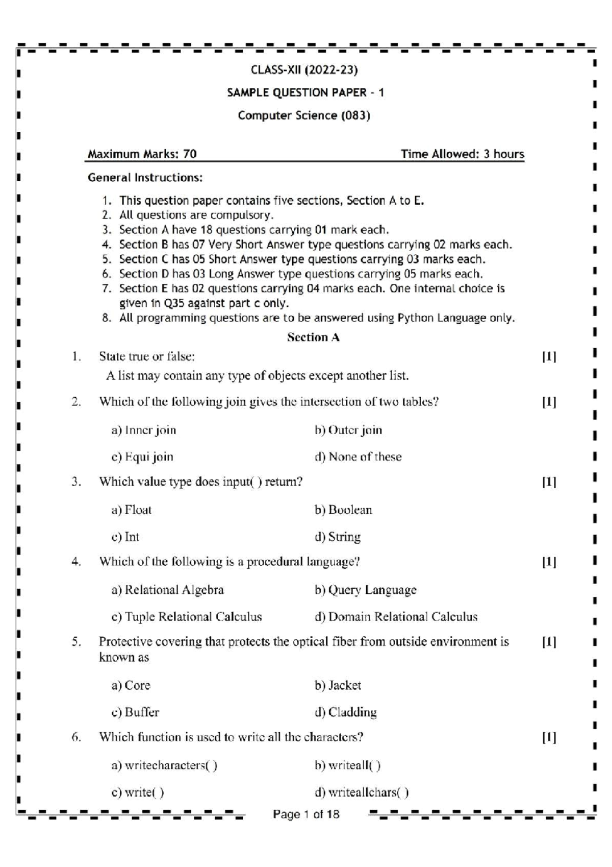 CBSE Computer Science 083 Sample Paper 1 | Preboard question paper 2023 ...