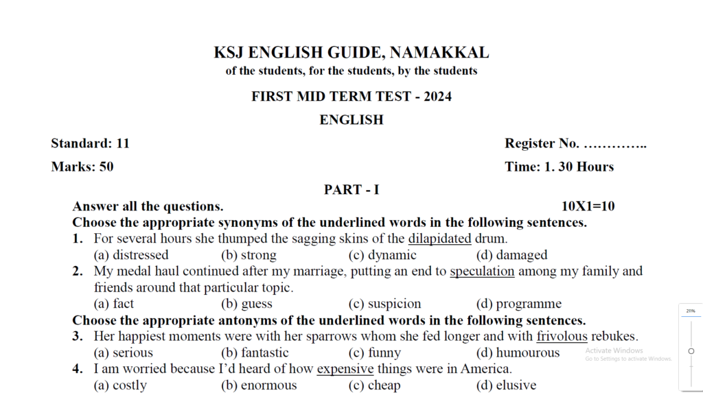 11th English First Mid Term Test Question Papers 2024 : Kalvi Nesan