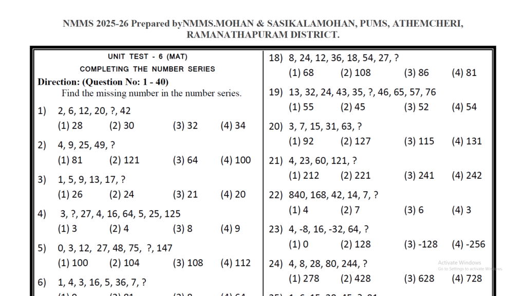 NMMS MAT Unit Test - 6 Questions English Medium 2025 - 2026 : Kalvi Nesan
