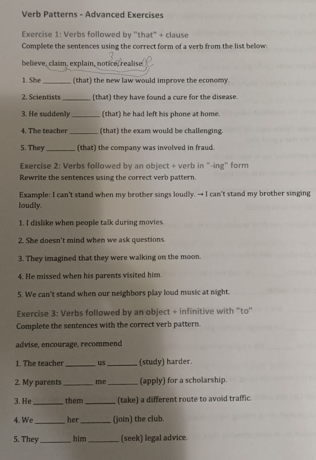 Verb Patterns - Advanced Exercises Exercise | StudyX