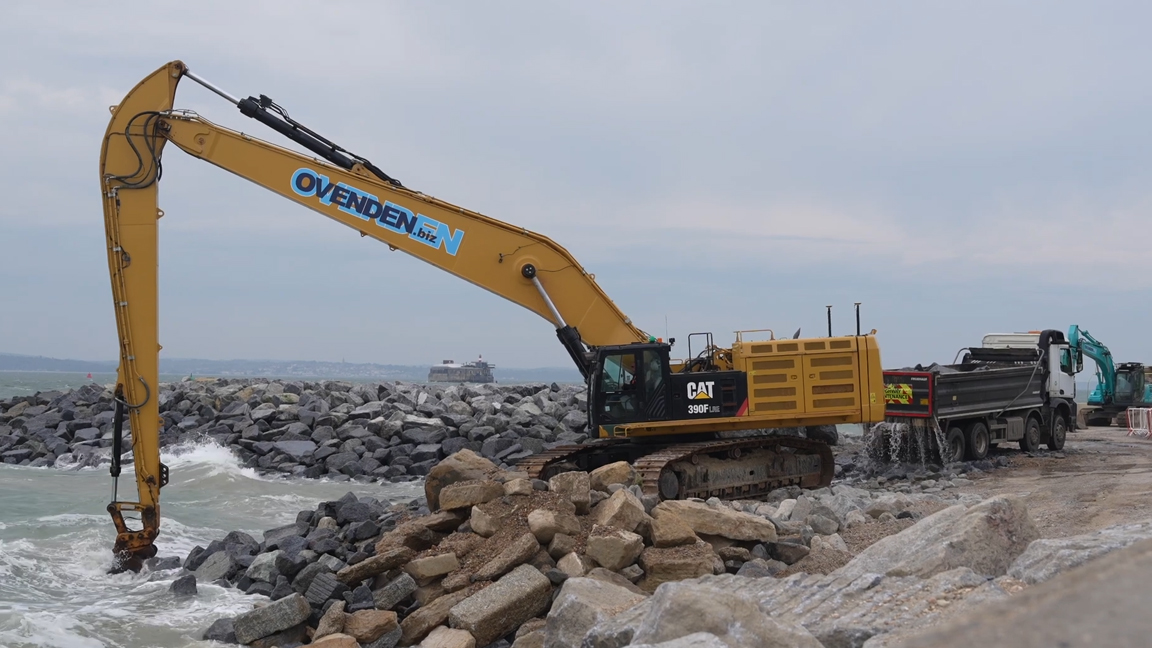 A closer look at large excavator work on a coastal project