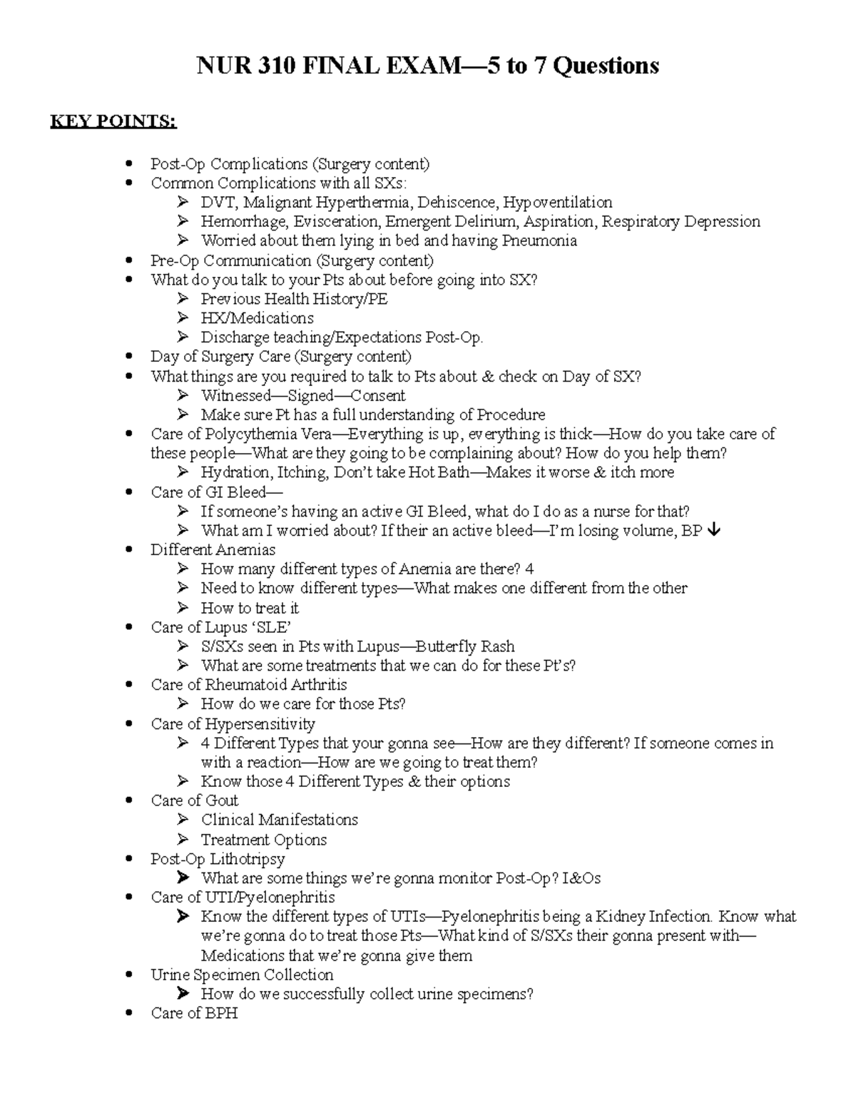 NUR 310 Final EXAM - study prep - NUR 310 FINAL EXAM—5 to 7 Questions ...
