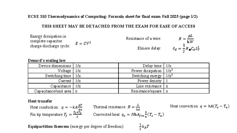 Formula Sheet for ECSE 310 Thermodynamics Final Exam Fall 2025 - Studocu