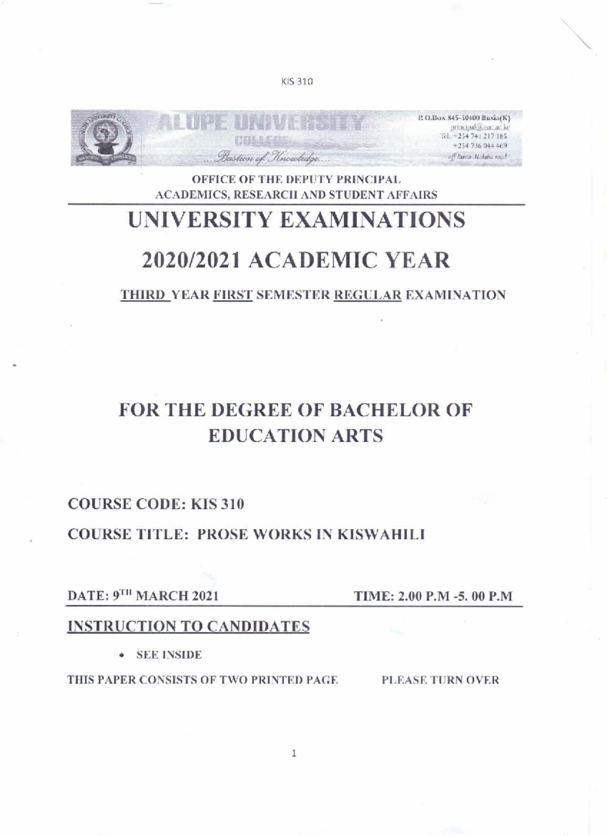 KIS 310 Final Exam: Prose Works in Kiswahili - Studocu