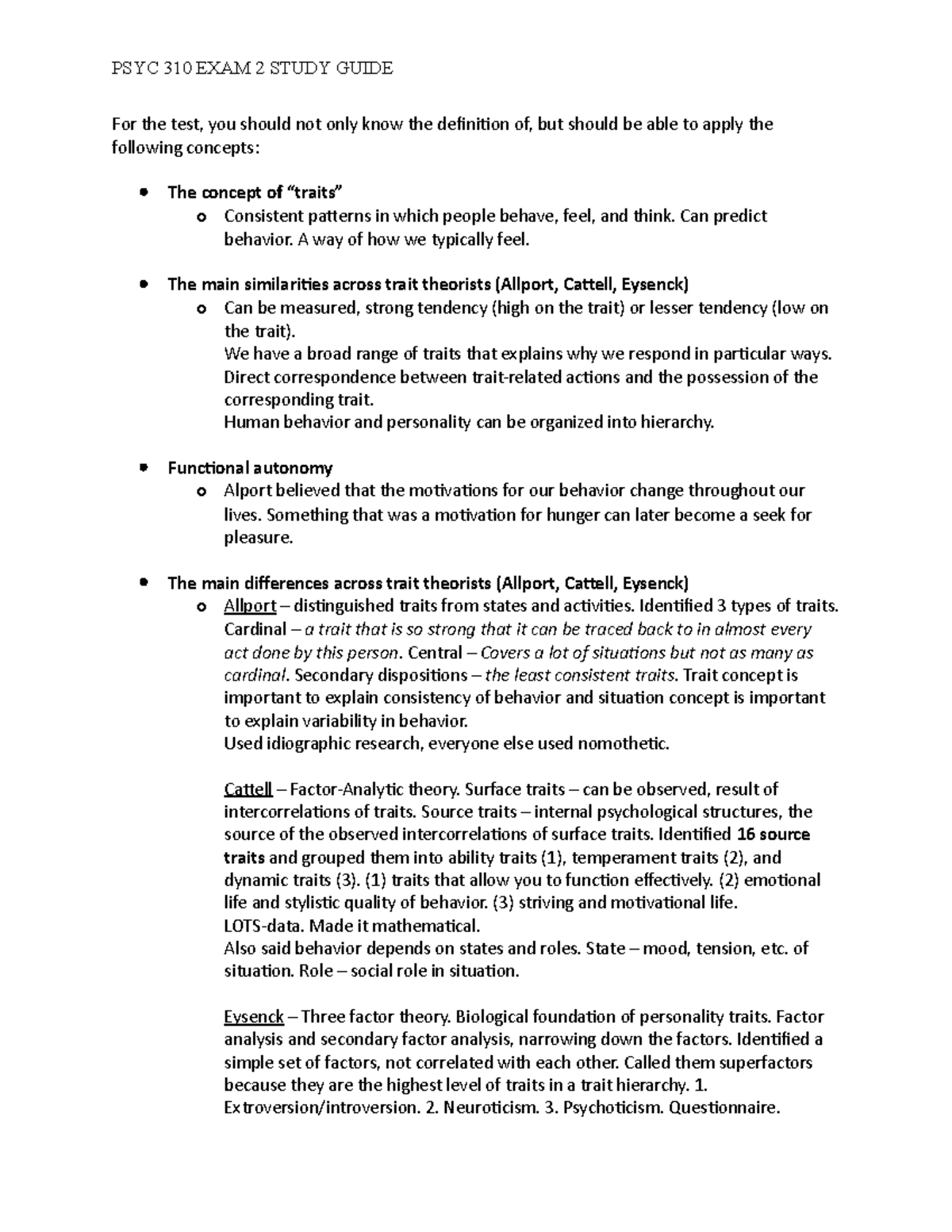 PSYC 310 - Final Exam Study Notes on Trait Theory and Personality - Studocu
