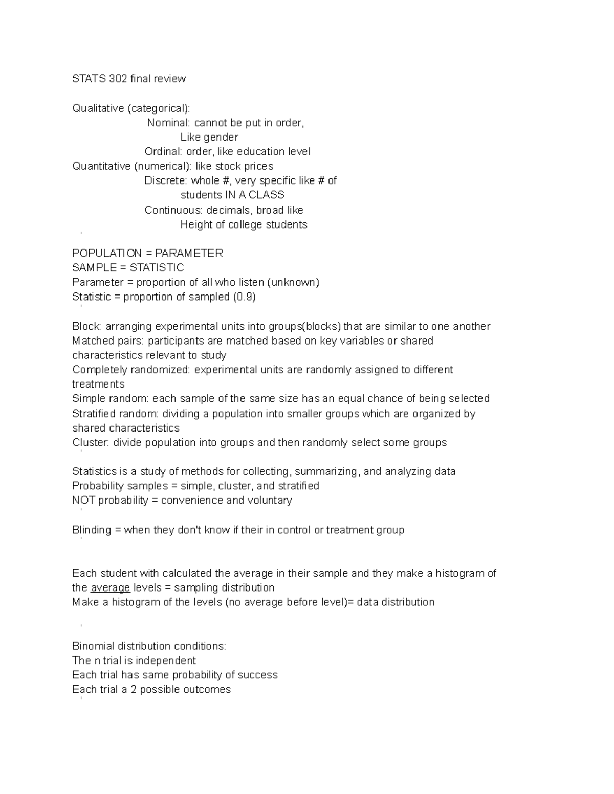 STATS 302 Final Exam Review Notes: Key Concepts and Definitions - Studocu