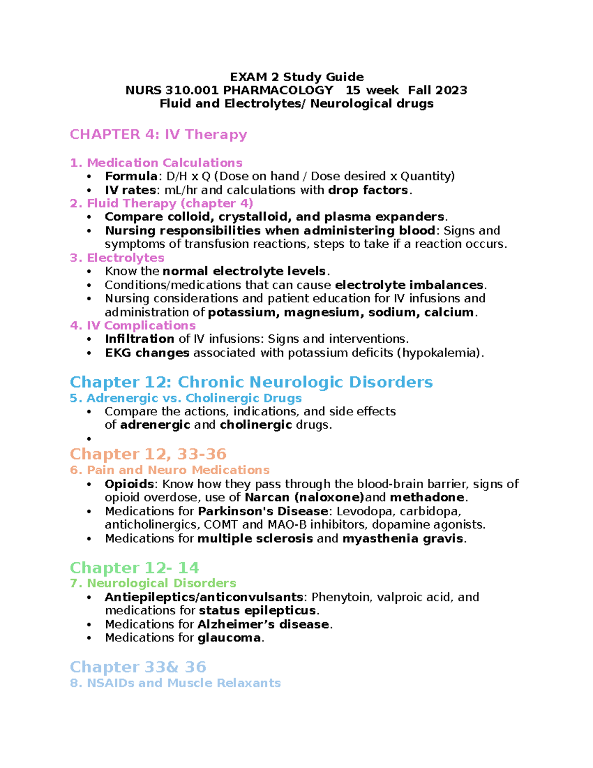 NURS 310 Final Exam Study Guide: Fluid & Electrolytes, Neuro Drugs ...