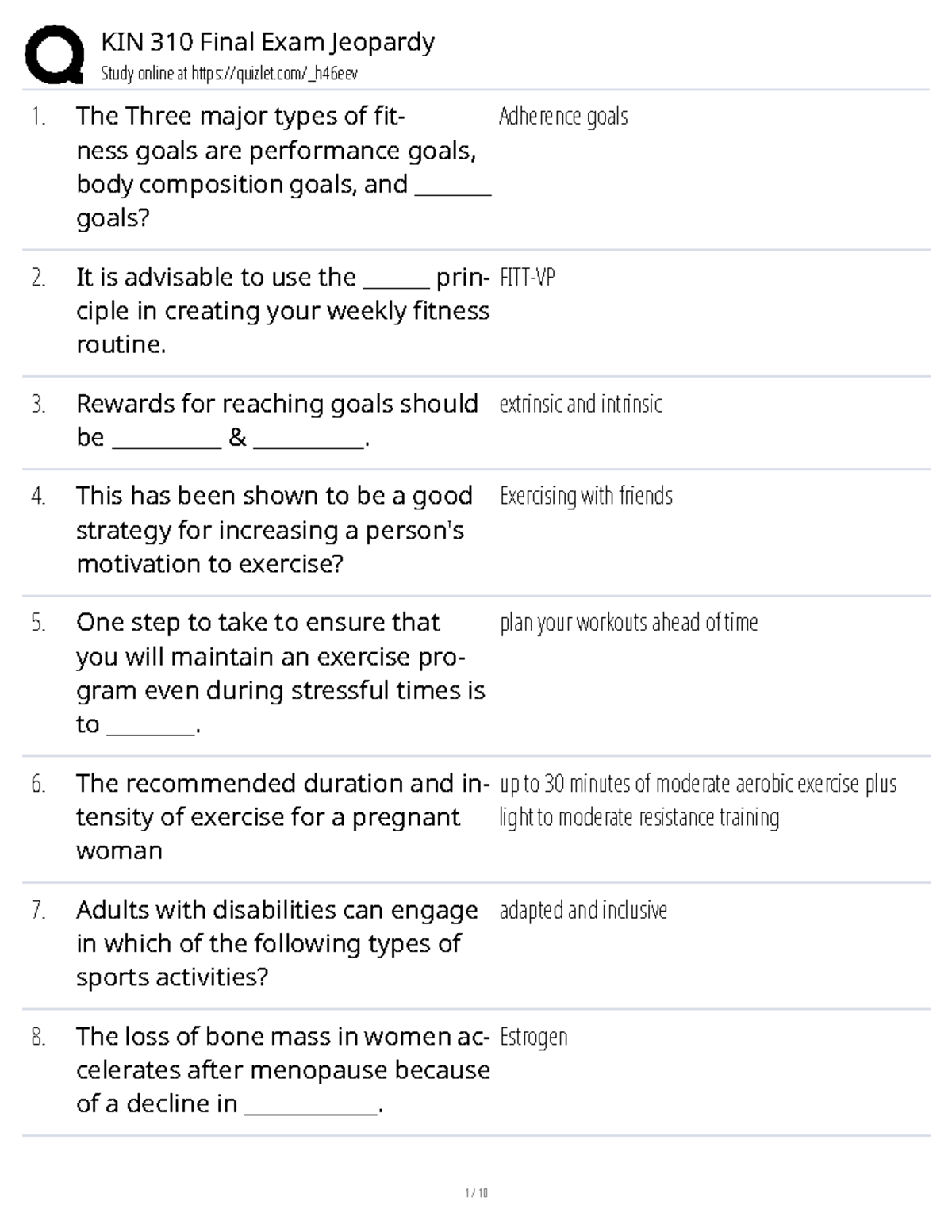 KIN 310 Final Exam Jeopardy Study Guide - Study online at quizlet ...