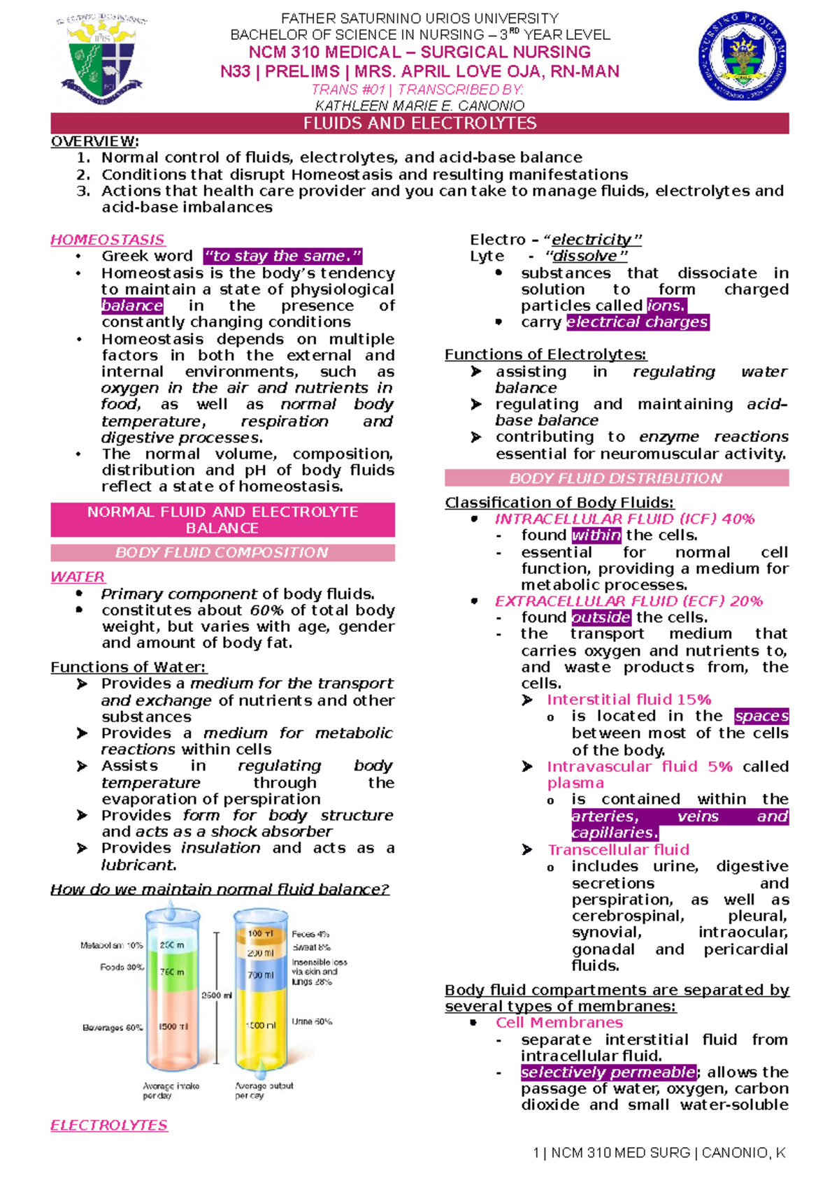 NCM 310 Final Exam Study Notes: Medsurg Fluids & Electrolytes - Studocu