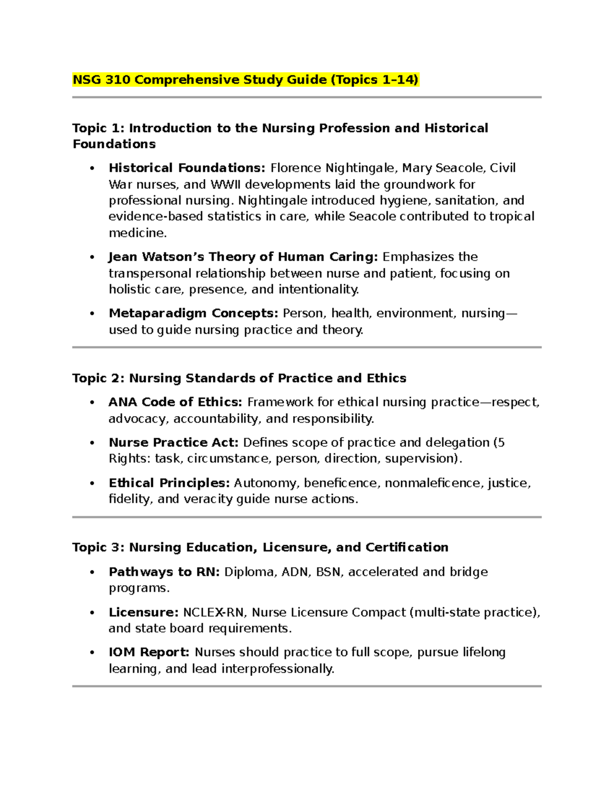 NSG 310 Exam 1 Study Guide 2025/2026: Master Professional Nursing ...