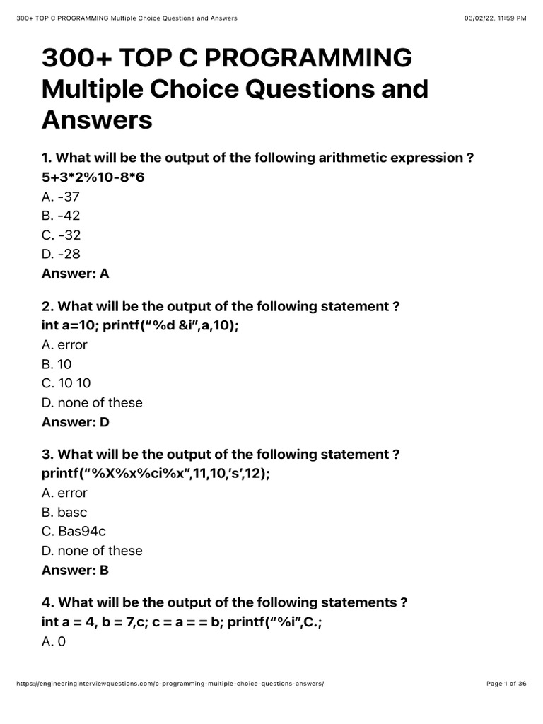 C Multiple Choice Questions | PDF | C (Programming Language) | Computer ...