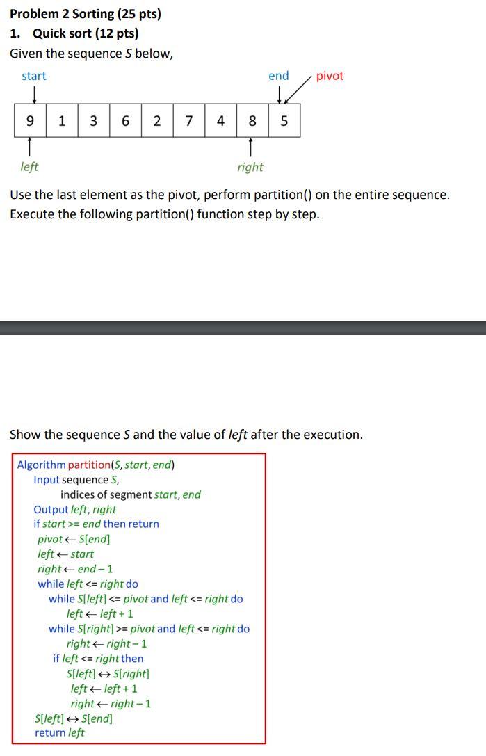 Solved Problem 2 Sorting (25 pts) 1. Quick sort (12 pts) | Chegg.com