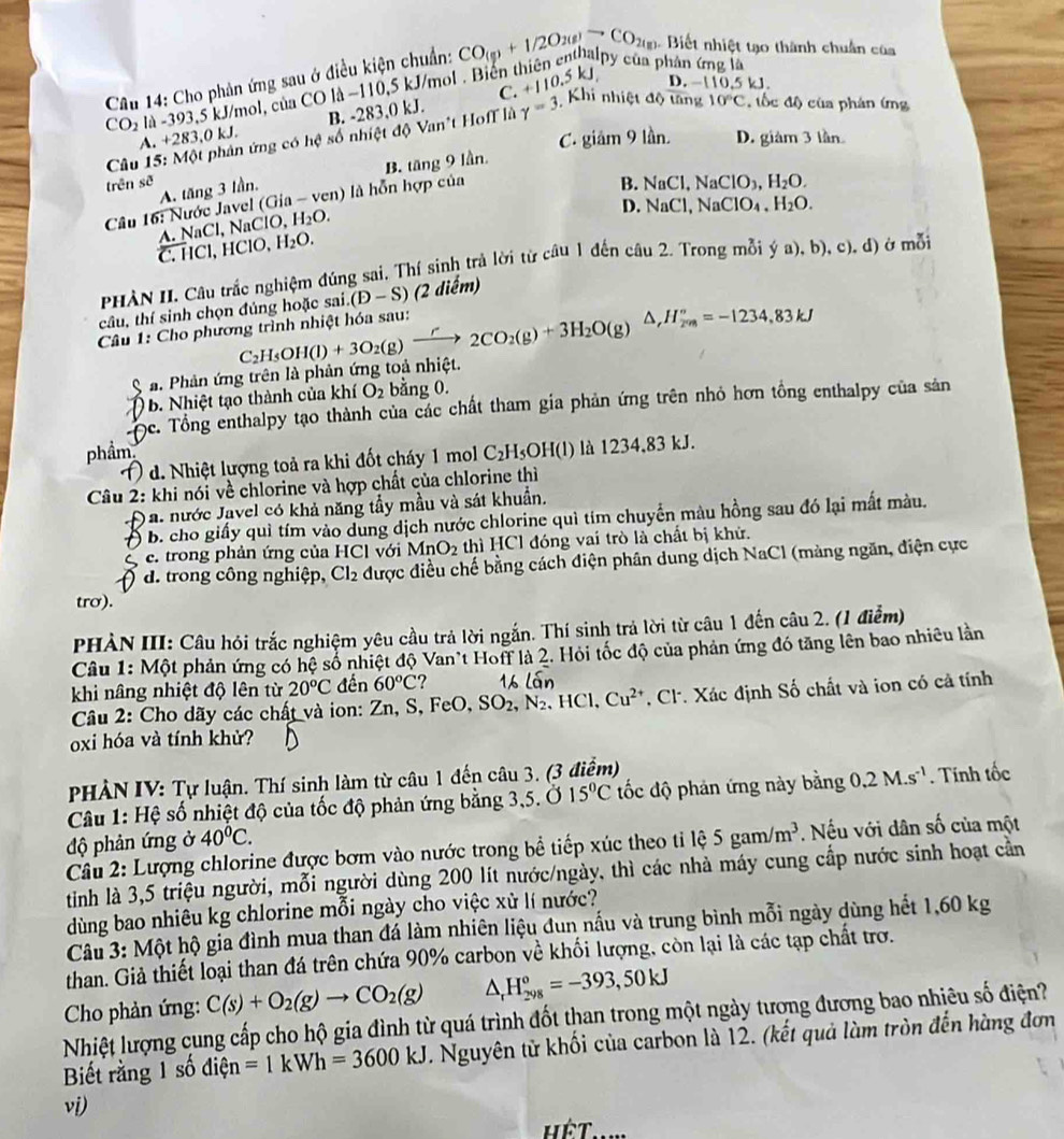 Giải quyết:Biết nhiệt tạo thành chuẩn của Câu 14: Cho phản ứng sau ở ...