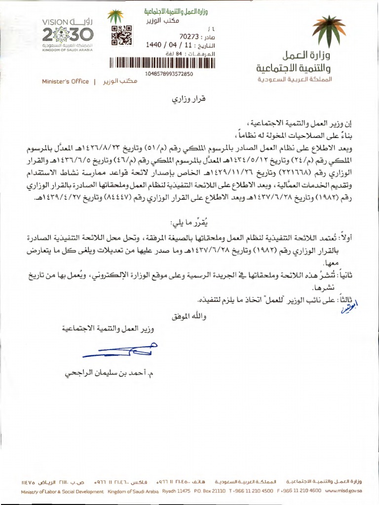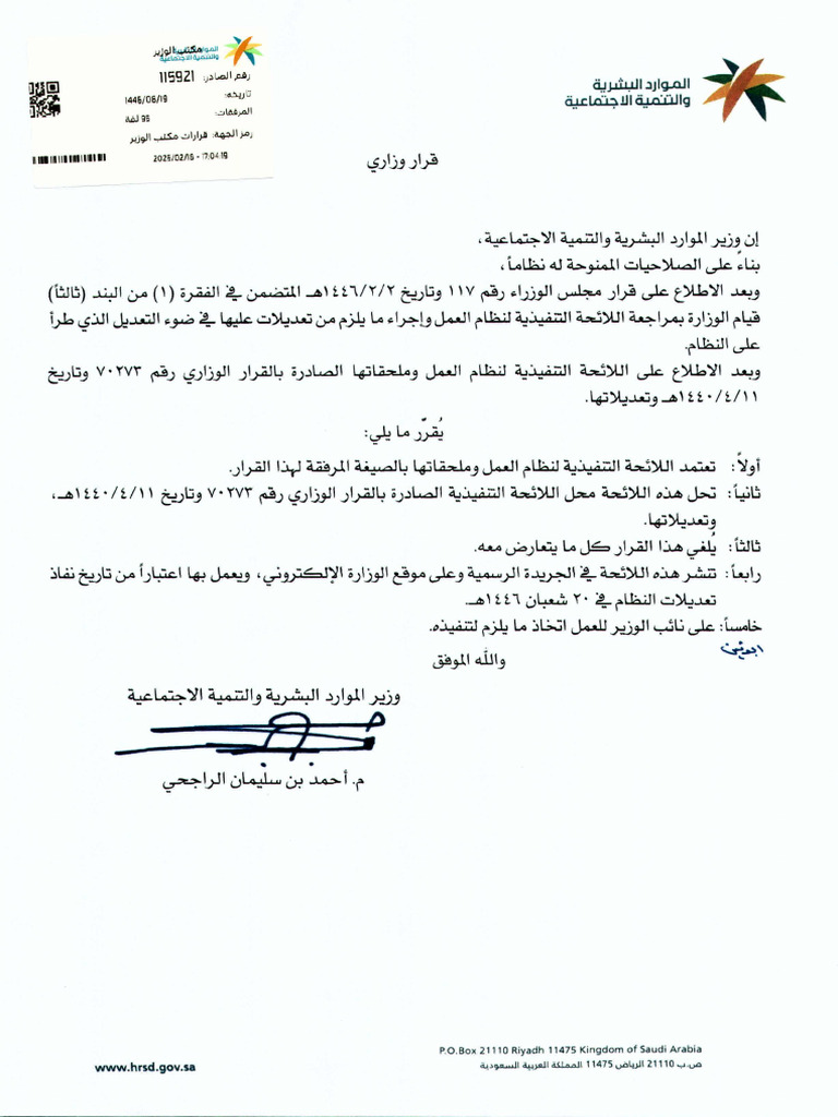قرار اعتماد اللائحة التنفيذية لنظام العمل وملحقاتها رقم 115921 | PDF