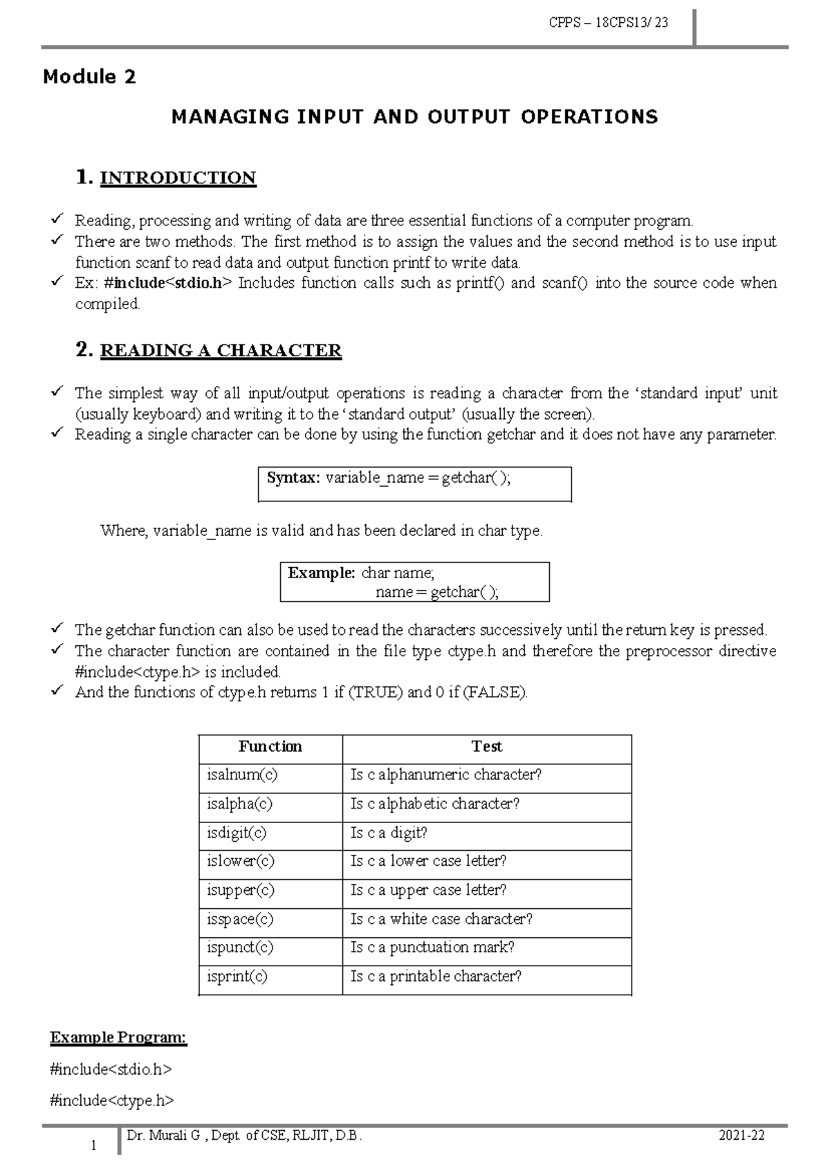 Module 2 Notes - Syntax: variable_name = getchar( ); Example: char name ...