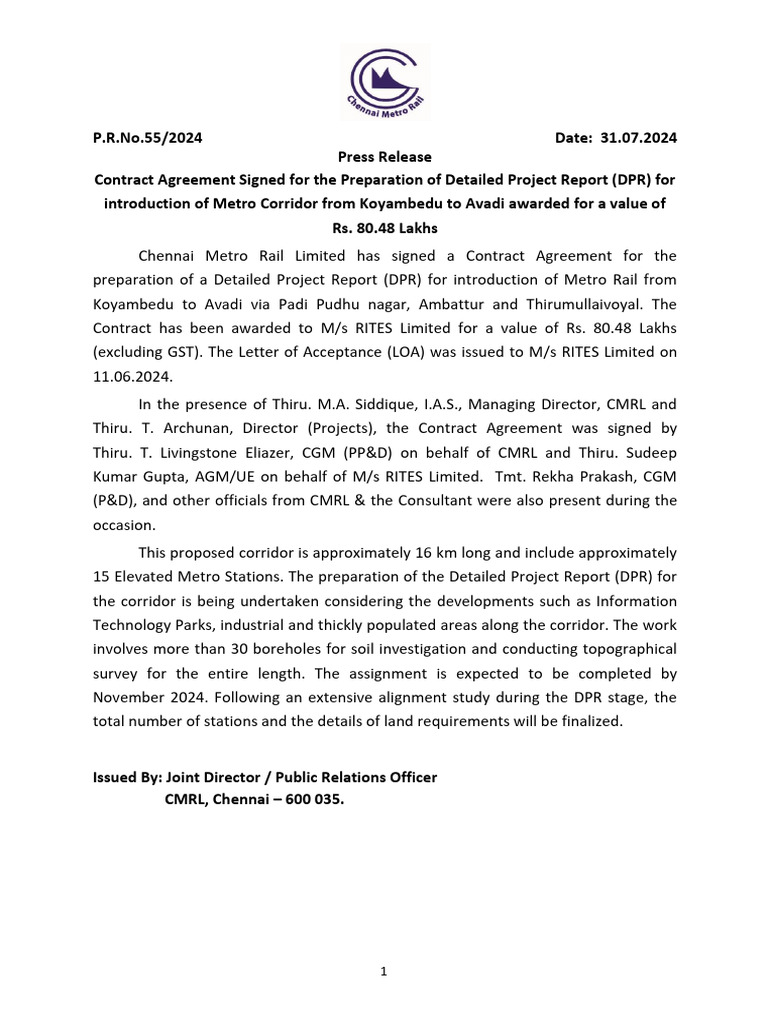 Metro Corridor DPR Contract Signed | PDF
