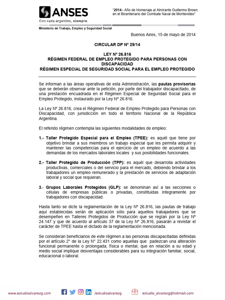 ANSES CIRCULAR DP Nº 29/14 LEY Nº 26.816 RÉGIMEN FEDERAL DE EMPLEO ...