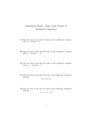 Arithmetic Series - Sum of the Terms of Arithmetic Sequence Worksheet ...