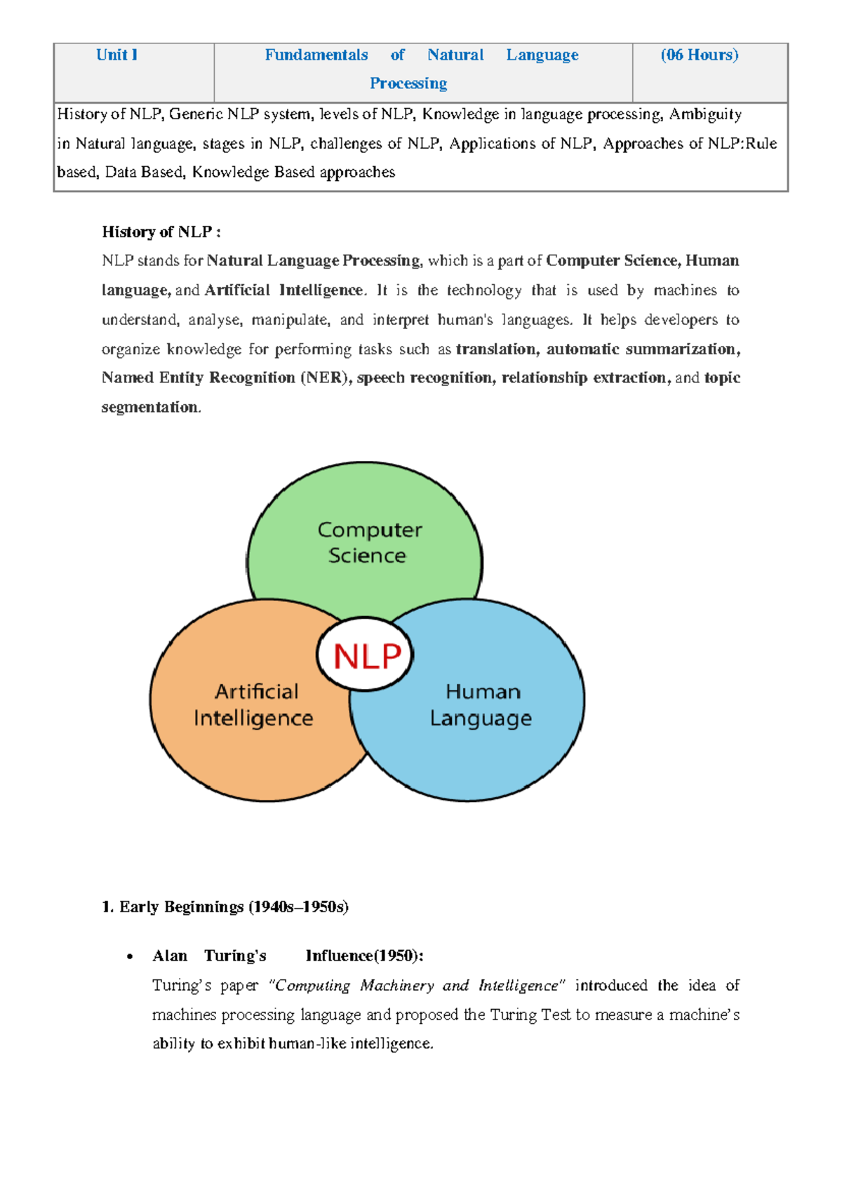 1 NLP - unit-1 notes of nlp - History of NLP : NLP stands for Natural ...