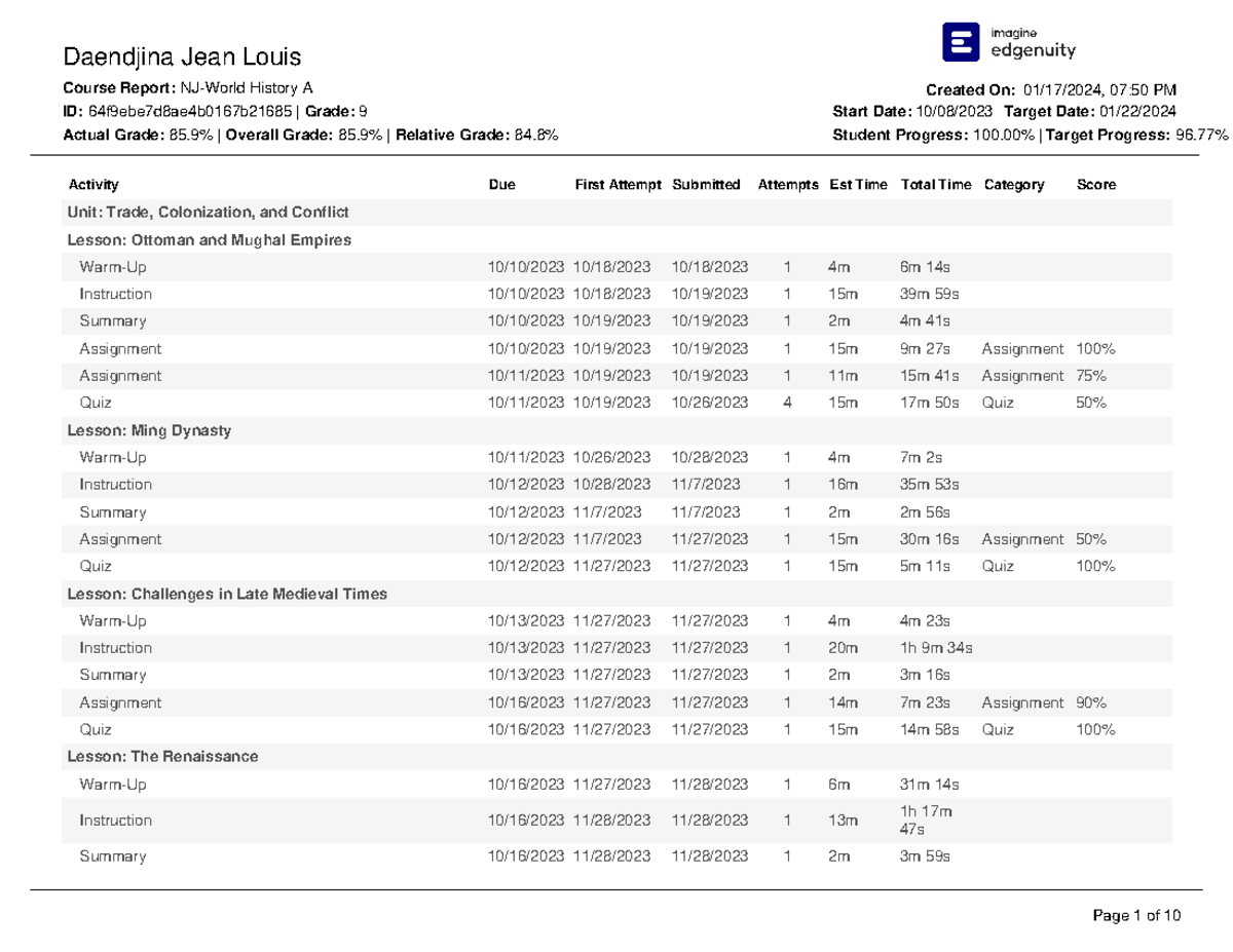 Course Report 01 17 2024 Jean Louis Daendji NJ-World History A ...