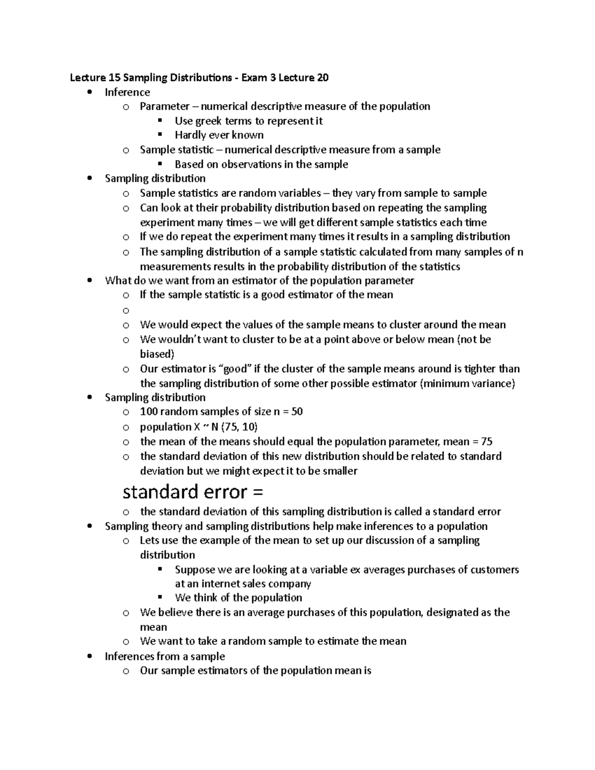 STAT408 Exam 2 notes - Lecture 15 Sampling Distributions - Exam 3 ...