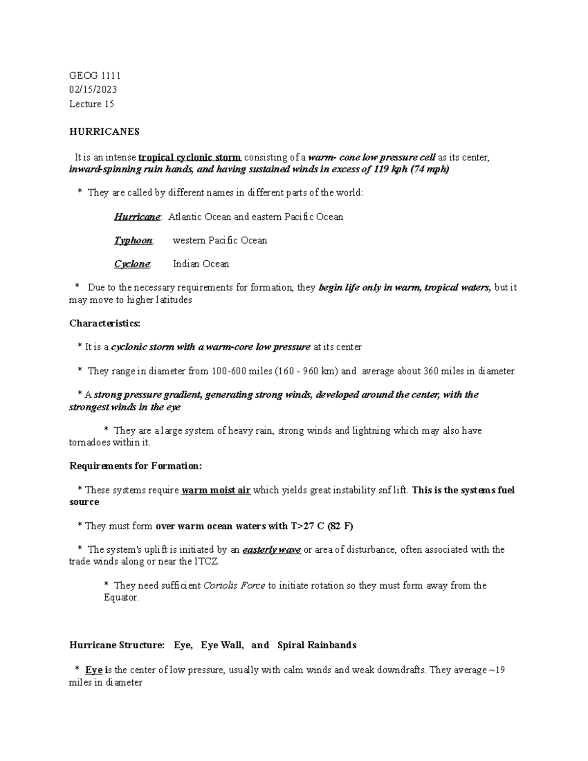 GEOG Lecture 15 - NOTES - GEOG 1111 02/15/ Lecture 15 HURRICANES It is ...