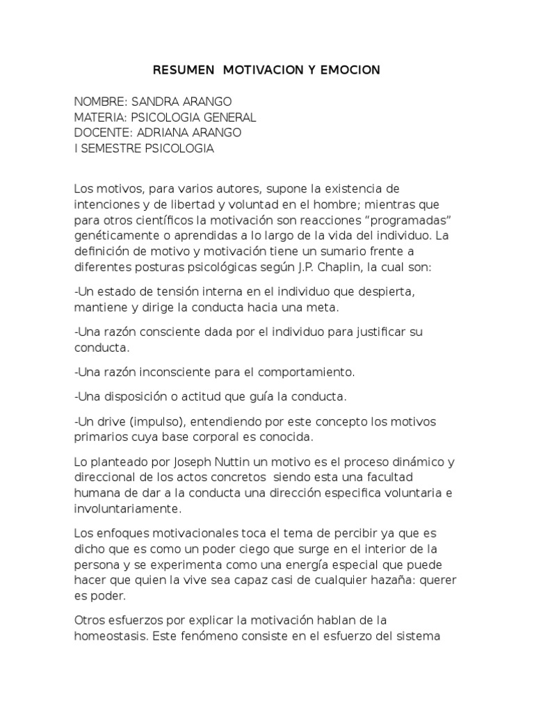 Resumen de Motivacion y Emocion Semana 1 Hasta La 4 | PDF ...