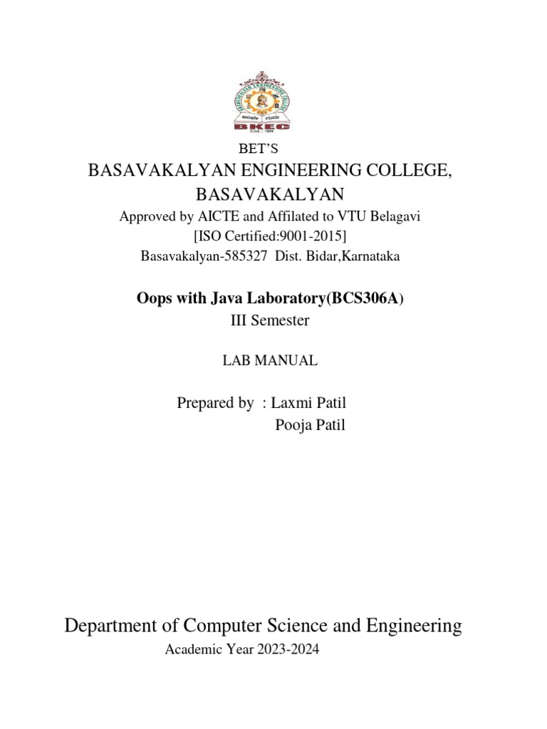 OOPS with Java BCS306A: Comprehensive Lab Manual for Semester III - Studocu
