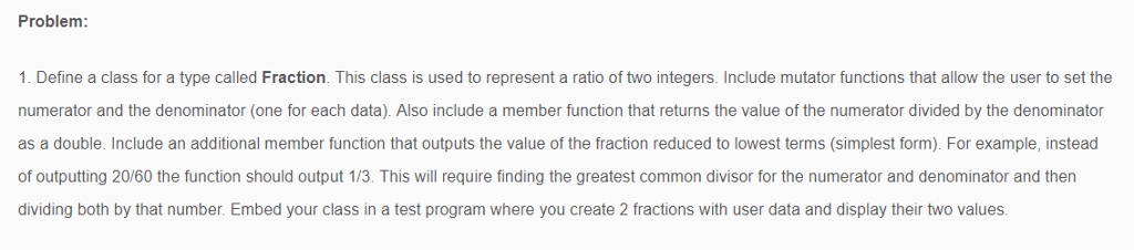 Solved Problem Define a class for a numerator and the | Chegg.com