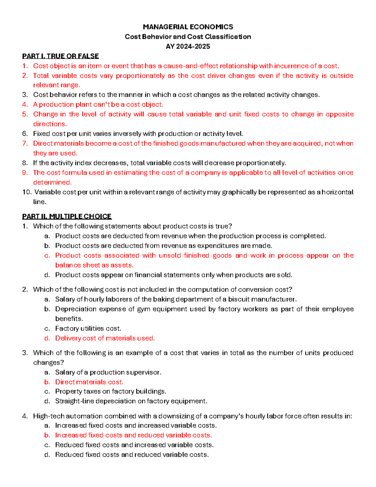 MANAGERIAL ECONOMICS Cost Behavior & Classification Quiz AY - Studocu