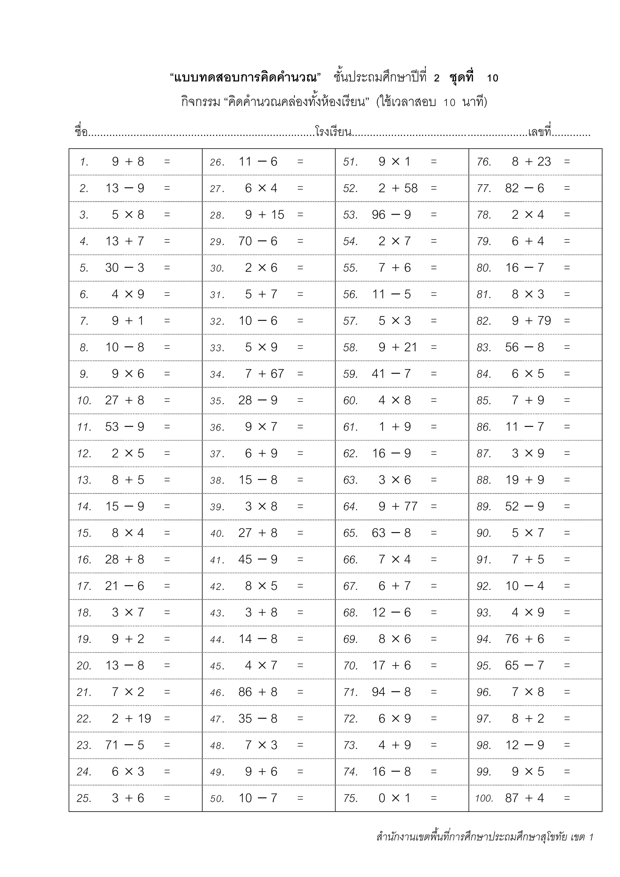 P2 แบบทดสอบคิดคำนวณคล่อง | PDF