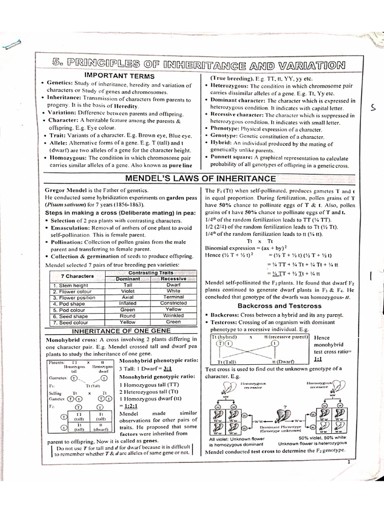 Principles of Inheritance Notes-1 | PDF | Dominance (Genetics) | Heredity
