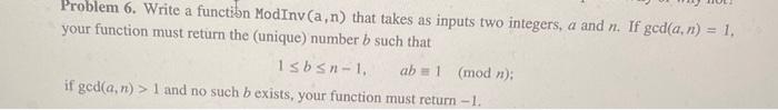 Solved Problem 6. Write a function ModInv (a,n) that takes | Chegg.com