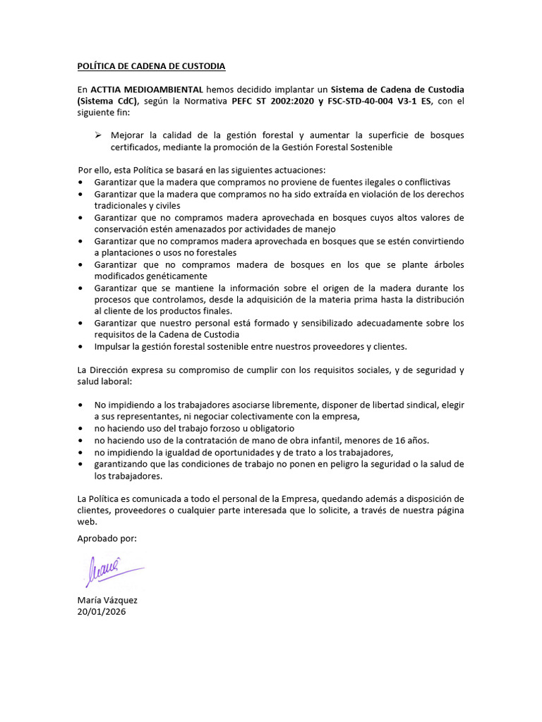 Política de Cadena de Custodia Pefc y FSC | PDF