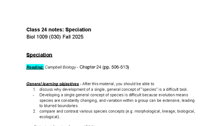 Class 24 Notes: Overview of Speciation for BIOL 1009 (030) Fall 2025 ...
