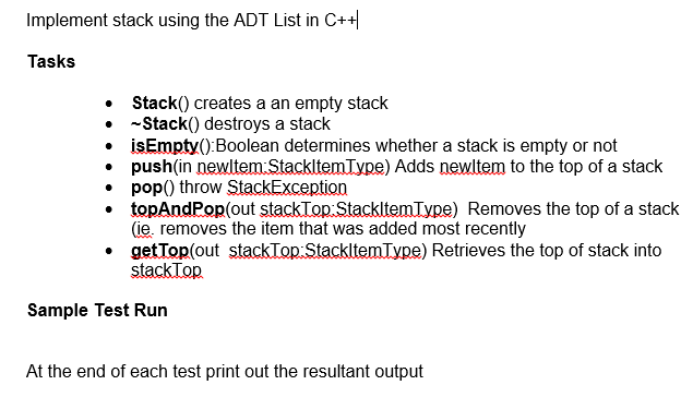 Solved Implement stack using the ADT List in C++|| Tasks • | Chegg.com