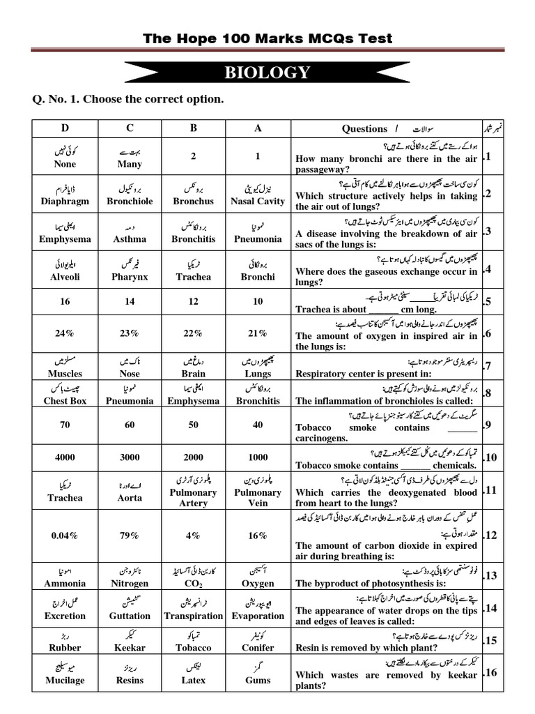 10th 100 Marks MCQs Test The Hope | PDF | Lung | Respiratory System