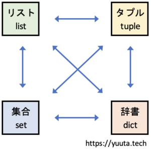 リスト、タプル、集合、辞書のオブジェクトの種類を相互に変換する方法 - Yuuta's Python notebook