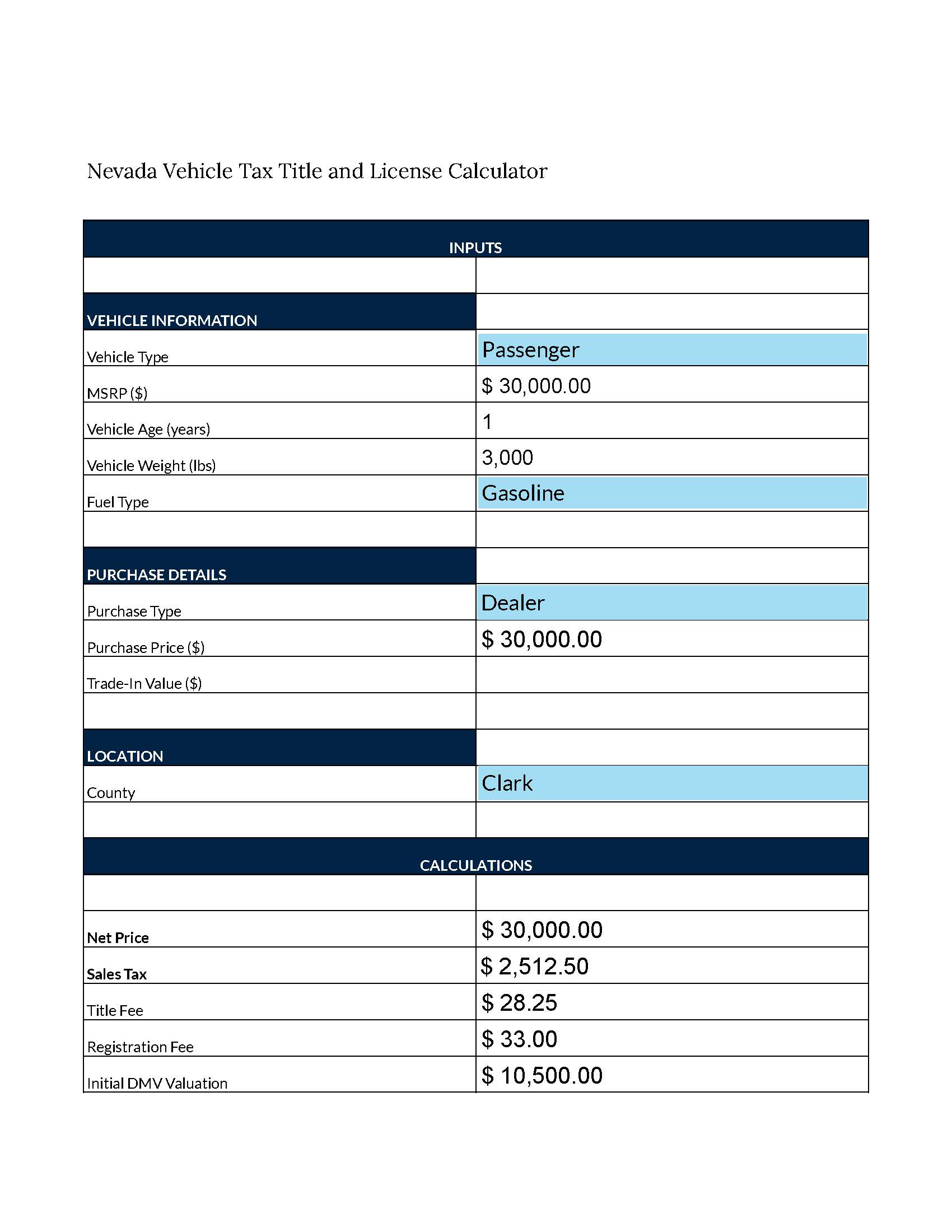 Nevada Vehicle Tax Title and License PDF Calculator | Vehicle Transfer Fee