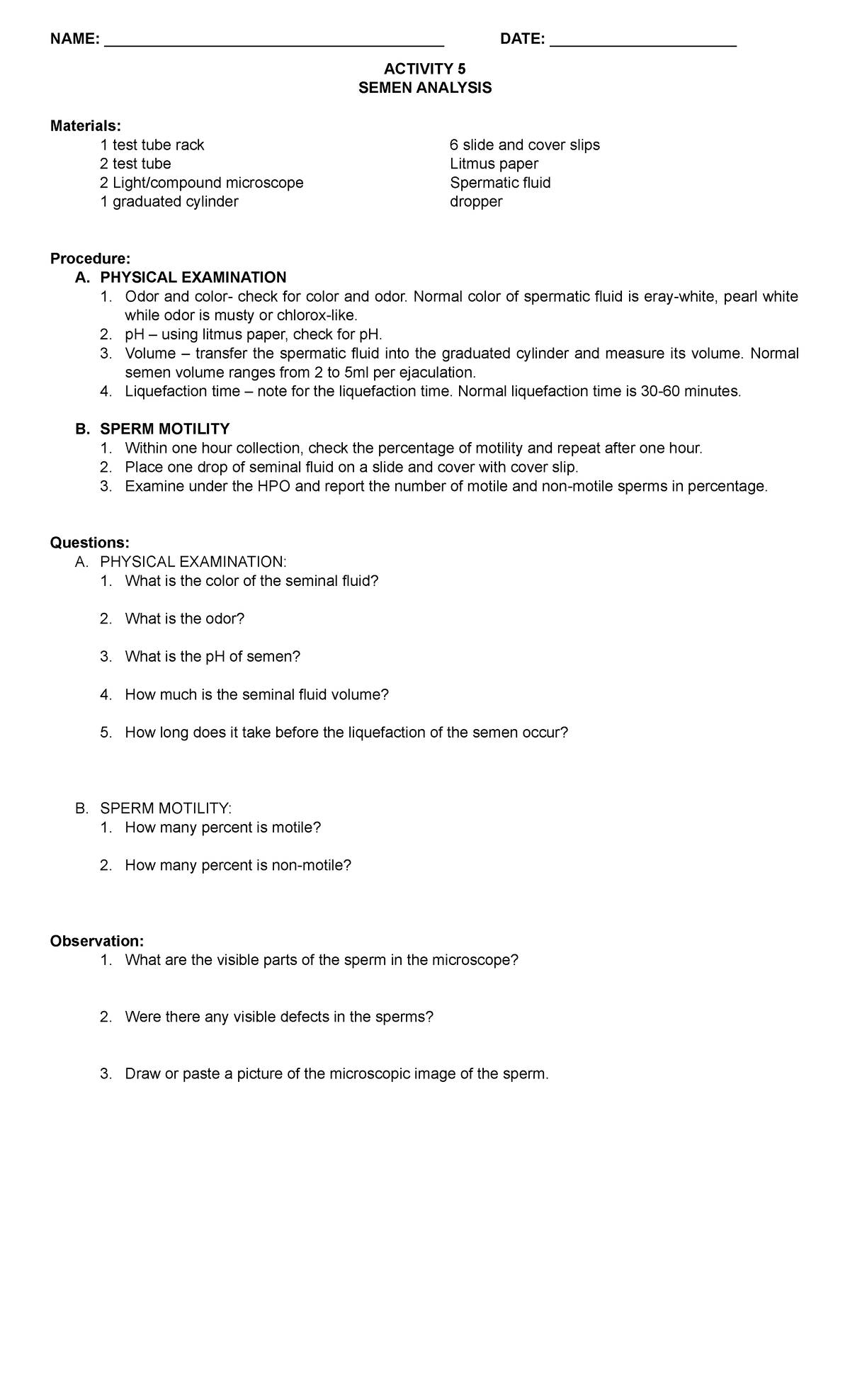 ACT - Lab Activity: Semen Analysis Procedures and Observations - Studocu