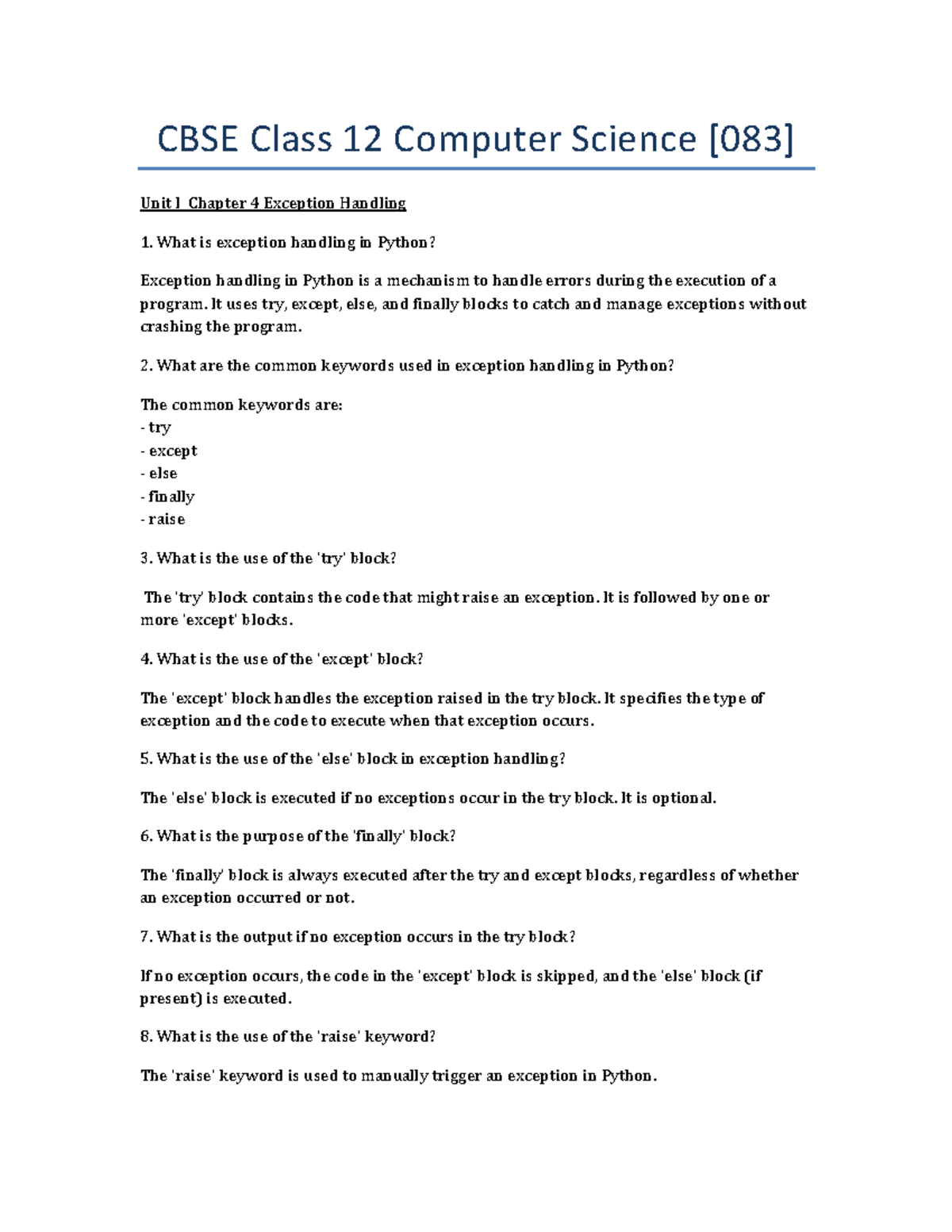 CBSE Class 12 Computer Science Unit I Chapter 4: Exception Handling ...