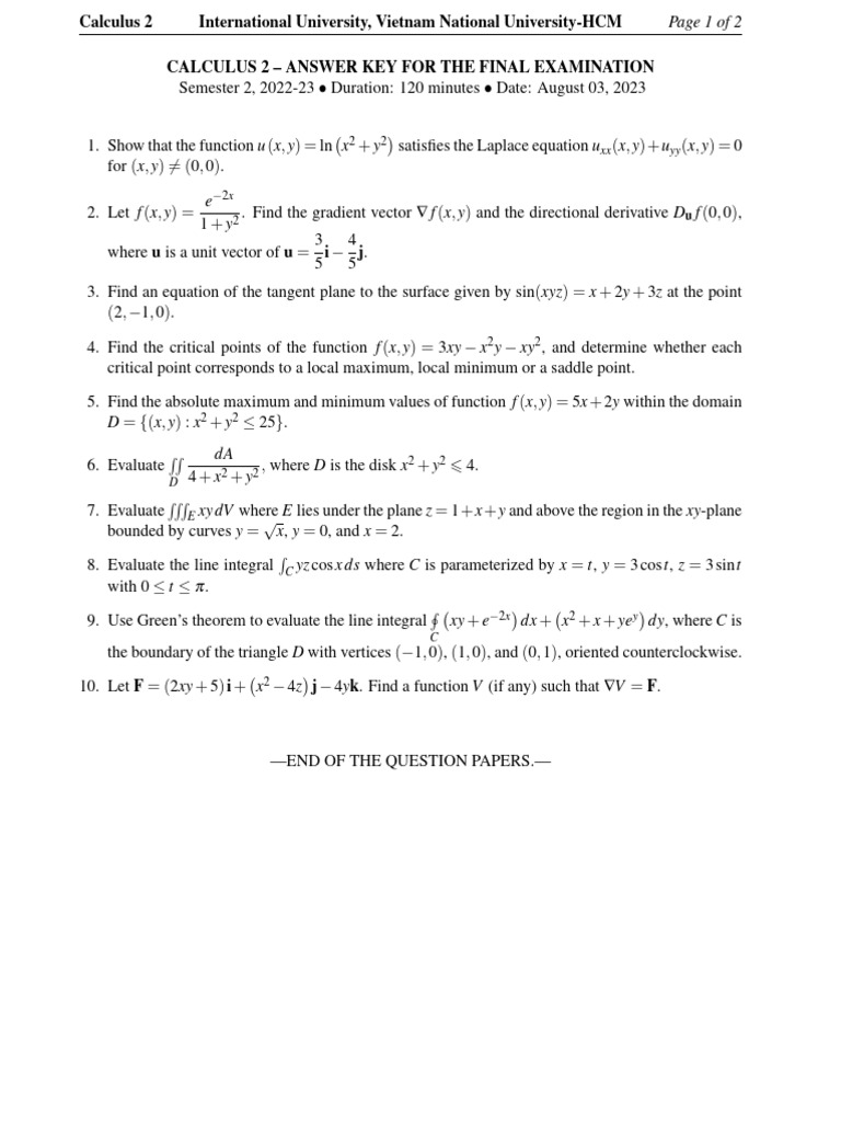 Cal2 FinalS2 August2023 With Answer Key | PDF | Multivariable Calculus ...