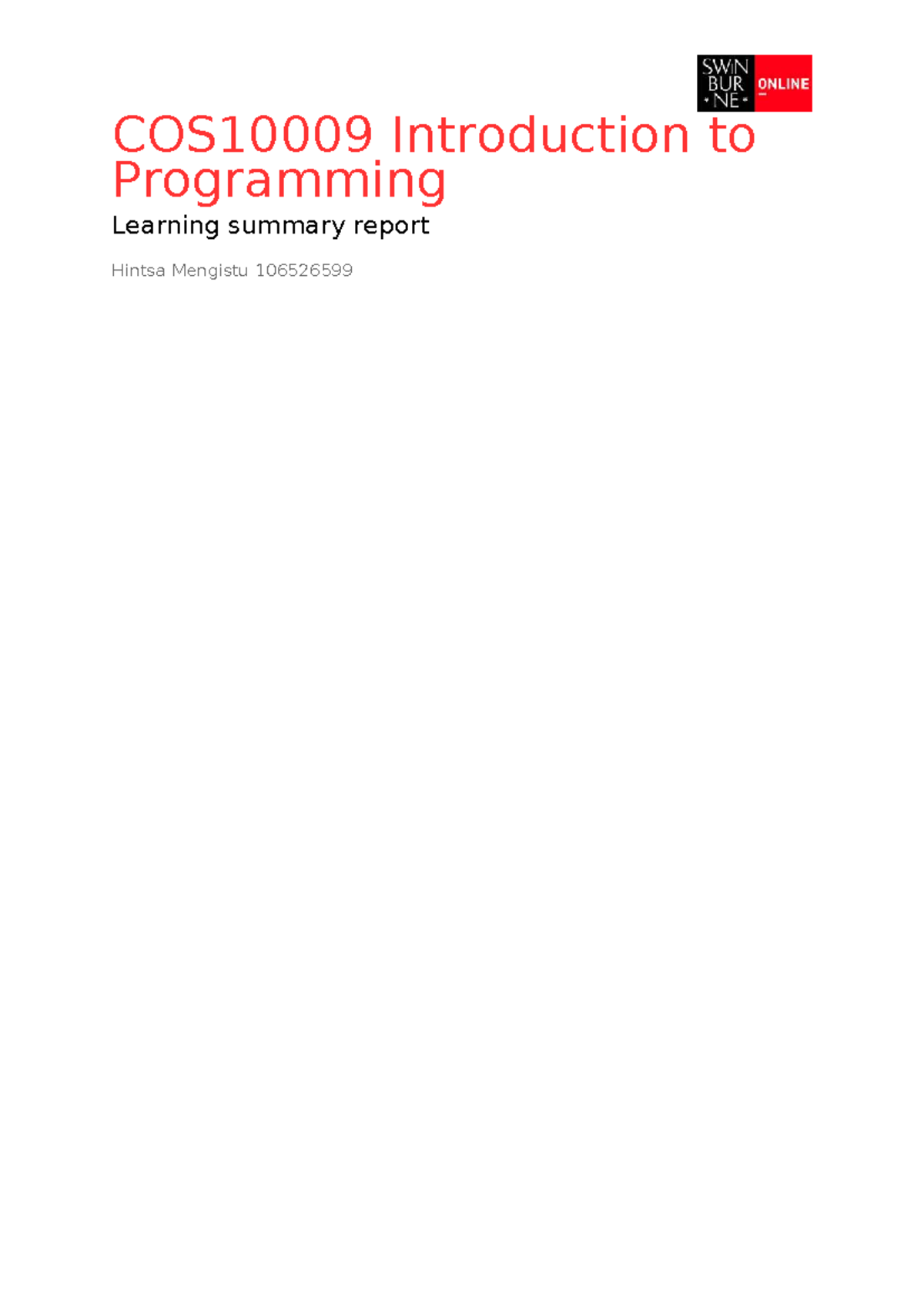 COS10009 Introduction to Programming Learning Summary Report - Studocu