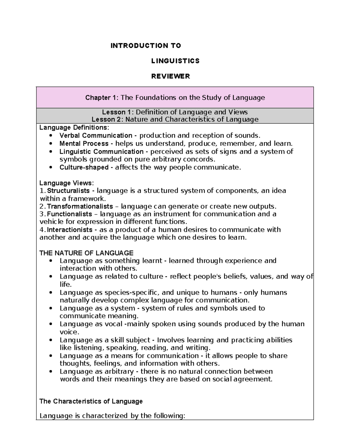INTRODUCTION TO LINGUISTICS REVIEWER: Chapter 1 & 2 Insights - Studocu