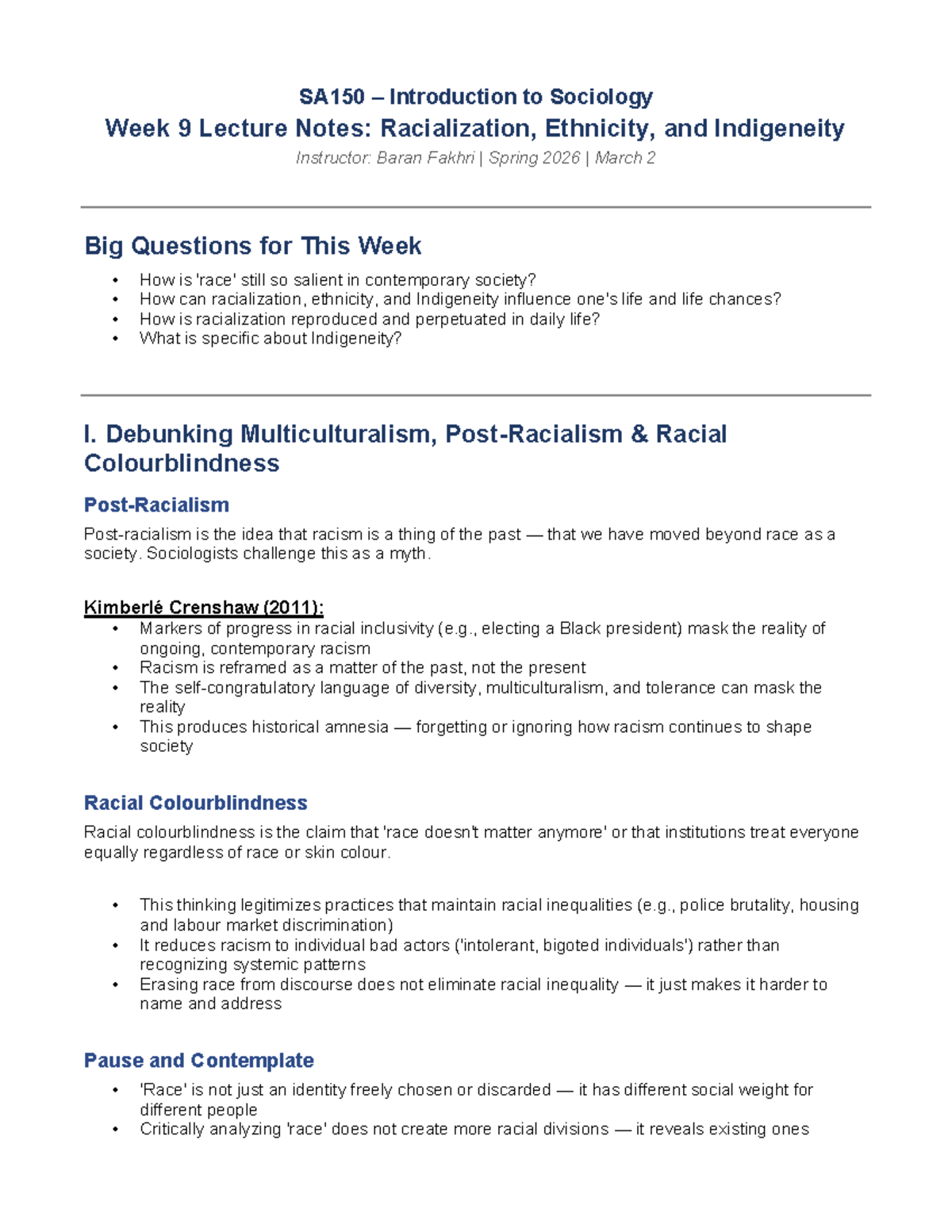 SA150 Introduction to Sociology Week 9 Lecture Notes: Racialization and ...