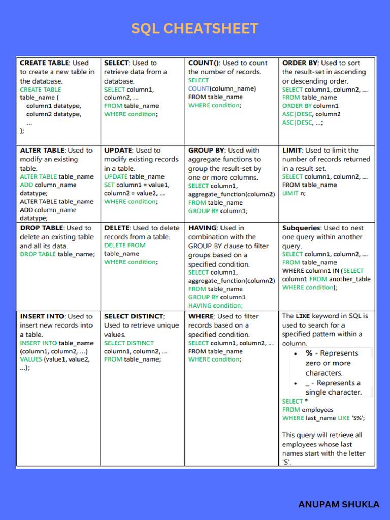 SQL Cheatsheet Pdf | Claudia Sifuentes | uDocz
