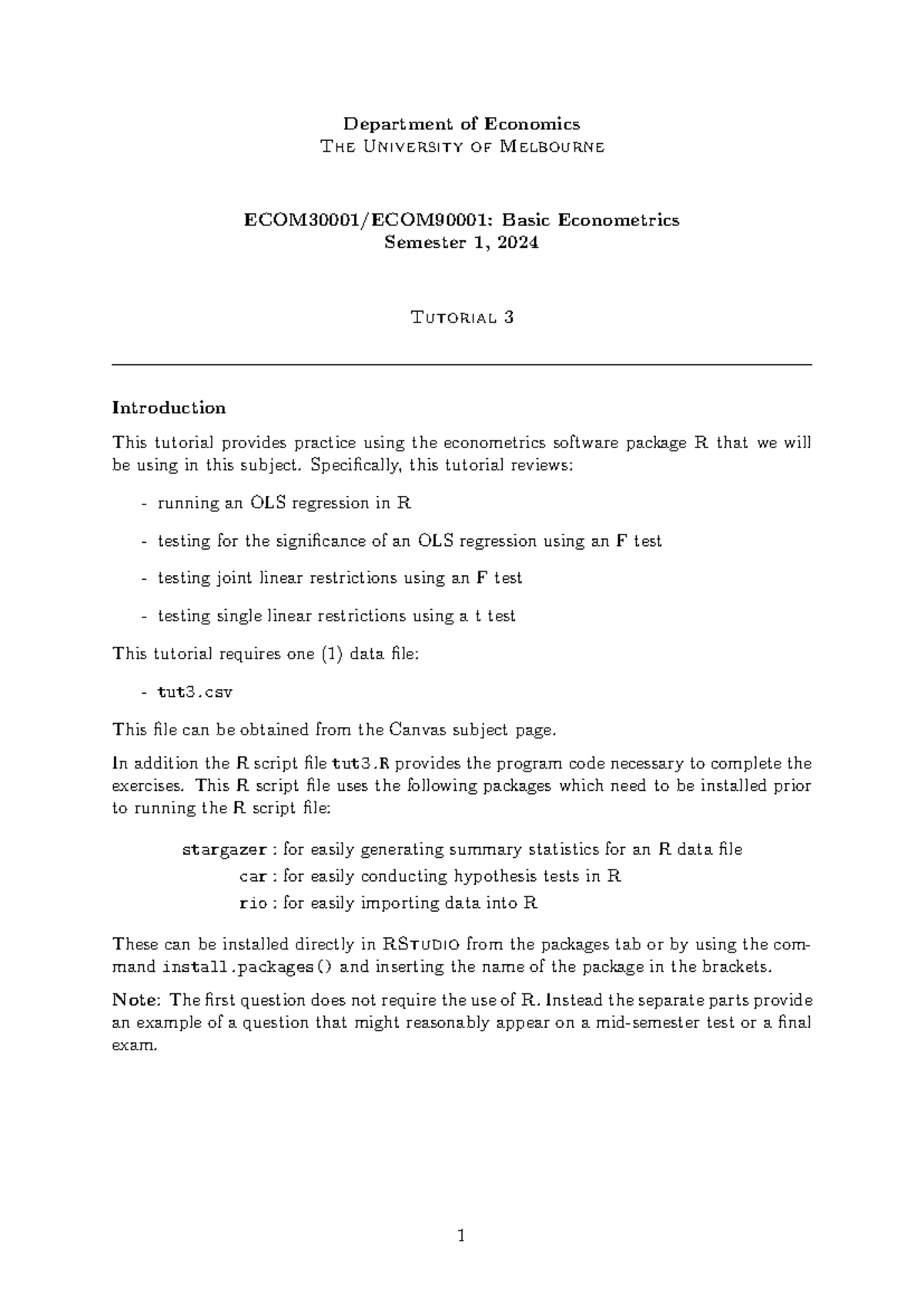 Basic Econometrics (ECON101) Semester 1, 2024 Tutorial 3: OLS ...