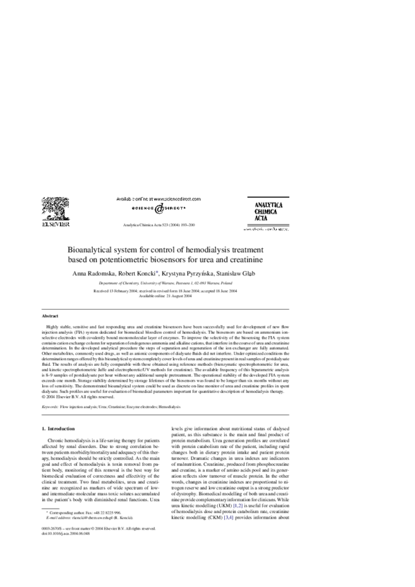 (PDF) Bioanalytical system for control of hemodialysis treatment based ...
